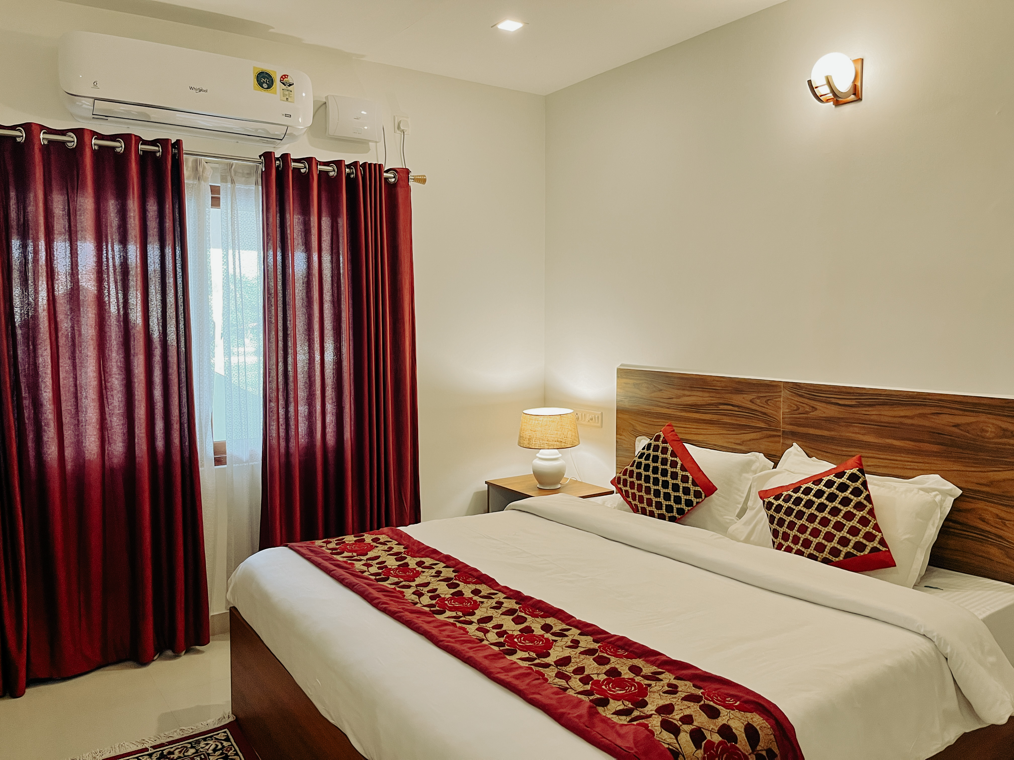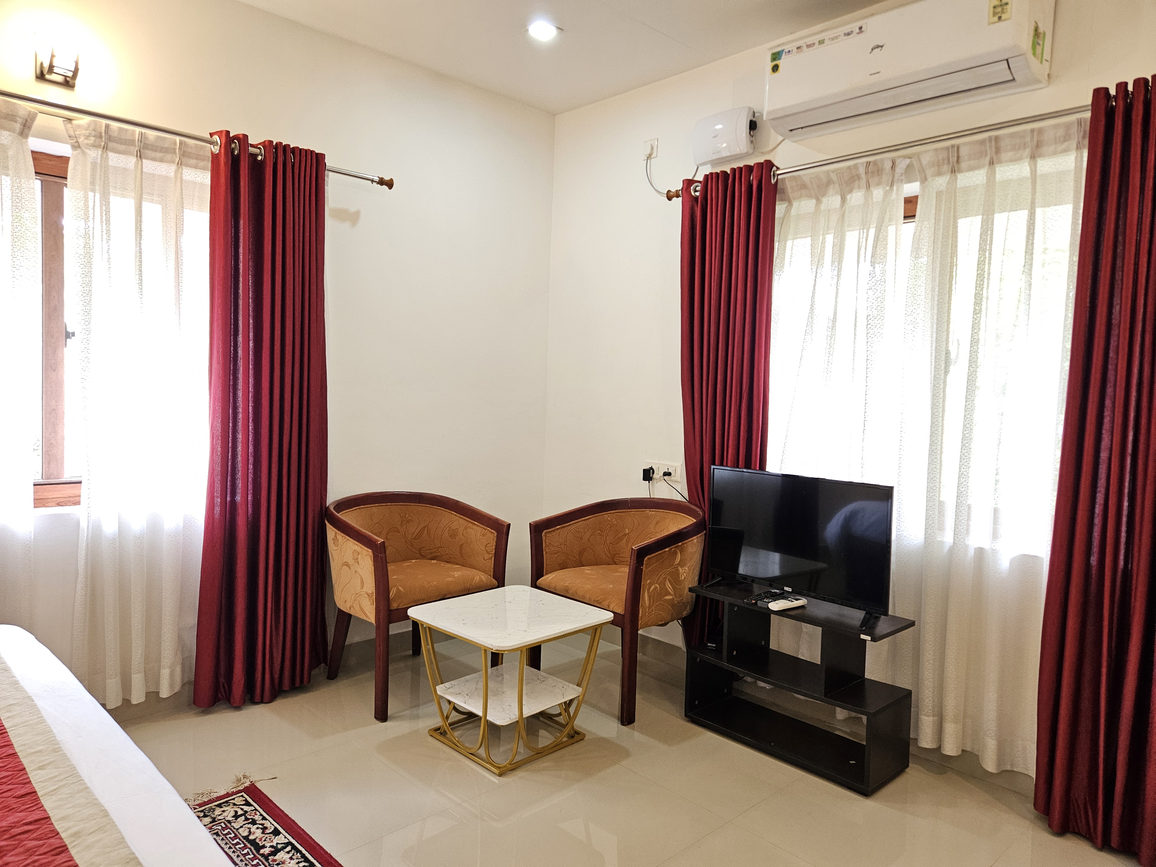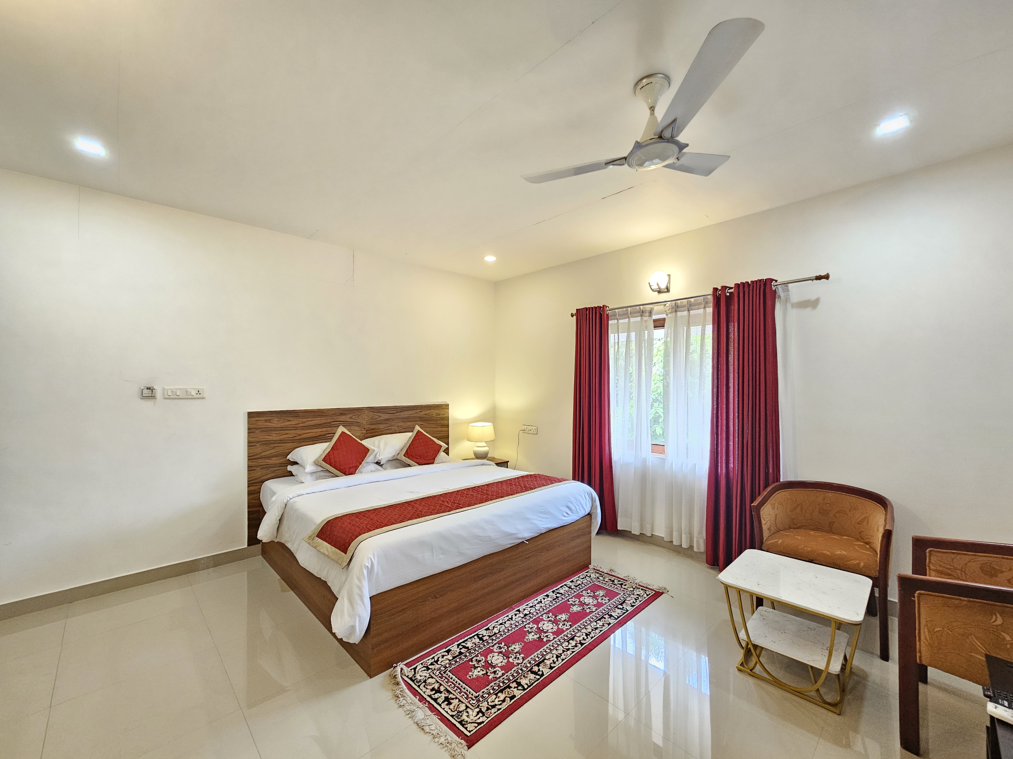Riverside Retreat comes the best views of the Pamba River in a spacious room with king-size bed, modern amenities, and full access to garden and dining spaces.